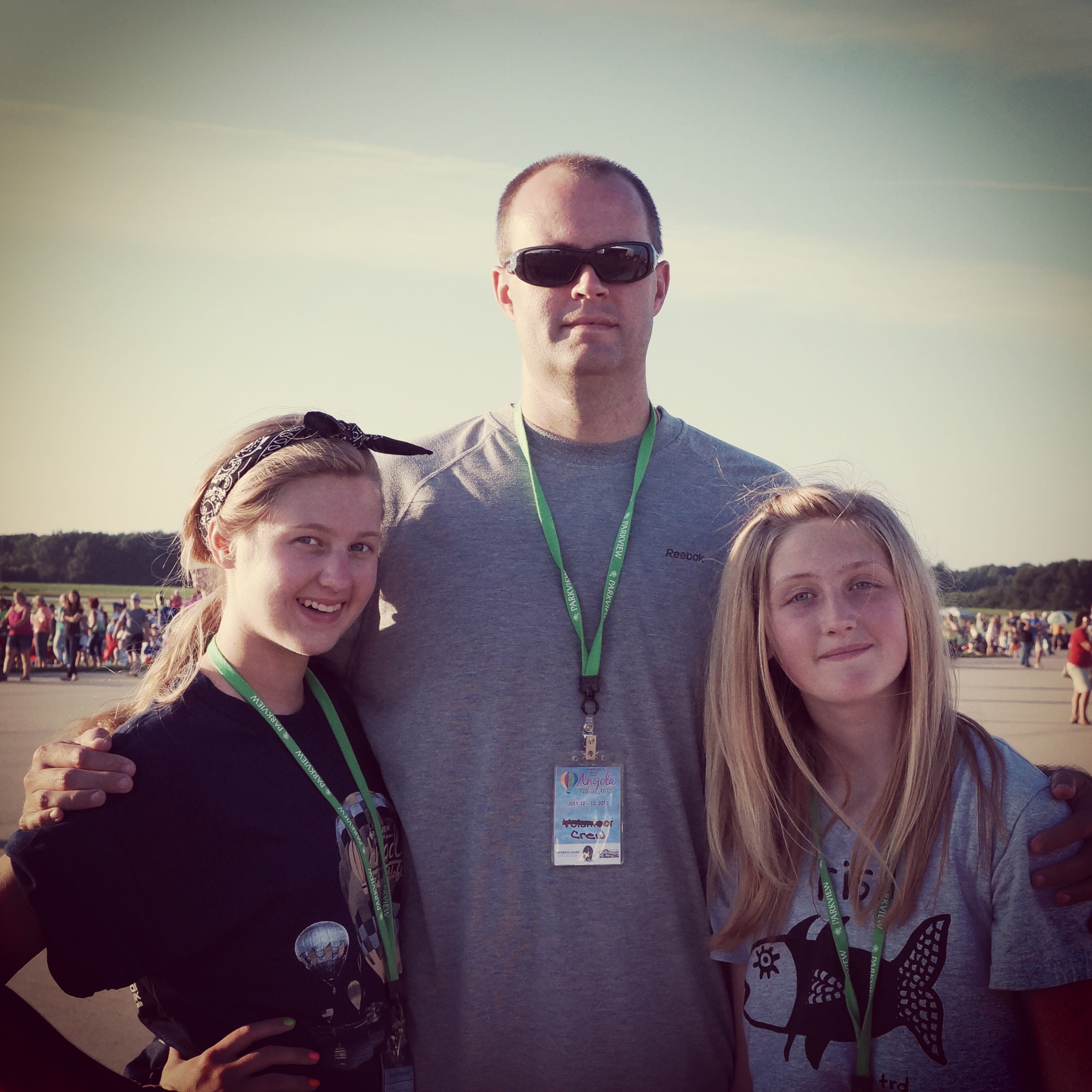 Upon arrival, we were assigned to the Oggy balloon crew. Unfortunately, the extremely windy conditions prohibited Oggy (and the other special shape balloons) from taking flight on that evening. They were just too big. We were a disappointed that we wouldn’t see Oggy is all of his glory, but we were still excited to help set him up for the late night illumination show. We helped unload him from the truck and spread him out for inflation. Wow, was he huge. After all of the preparations were complete, he was attached to the basket and filled with air. That is when the work began. The windy conditions made it very difficult to keep Oggy upright. Erica, the girls, and other volunteers worked to keep the basket on the ground. I took my place at the crown. I held a rope that attached to the top of Oggy’s head. My goal was to play tug-a-war with him. We he started to go left, I attempted to move him right. If he fell forward, I pulled back. It truly was a wrestling match. A match that I lost. At times, I was pulled and dragged across the grounds of the Steuben County Airport, struggling to gain footing in the grass. I discovered muscles in my arms and in my back that I had long forgotten. I could have used the 45 pounds that have lost over the last few months as leverage. I fought a battle that I didn’t expect to win. Actually, I knew that I couldn’t win. Jack, Oggy’s pilot, told me upfront that I would lose. He wasn’t lying. After the illumination ceremony, we helped deflate Oggy, rolled him up, and load him into the truck. It was a workout, but we had a blast!