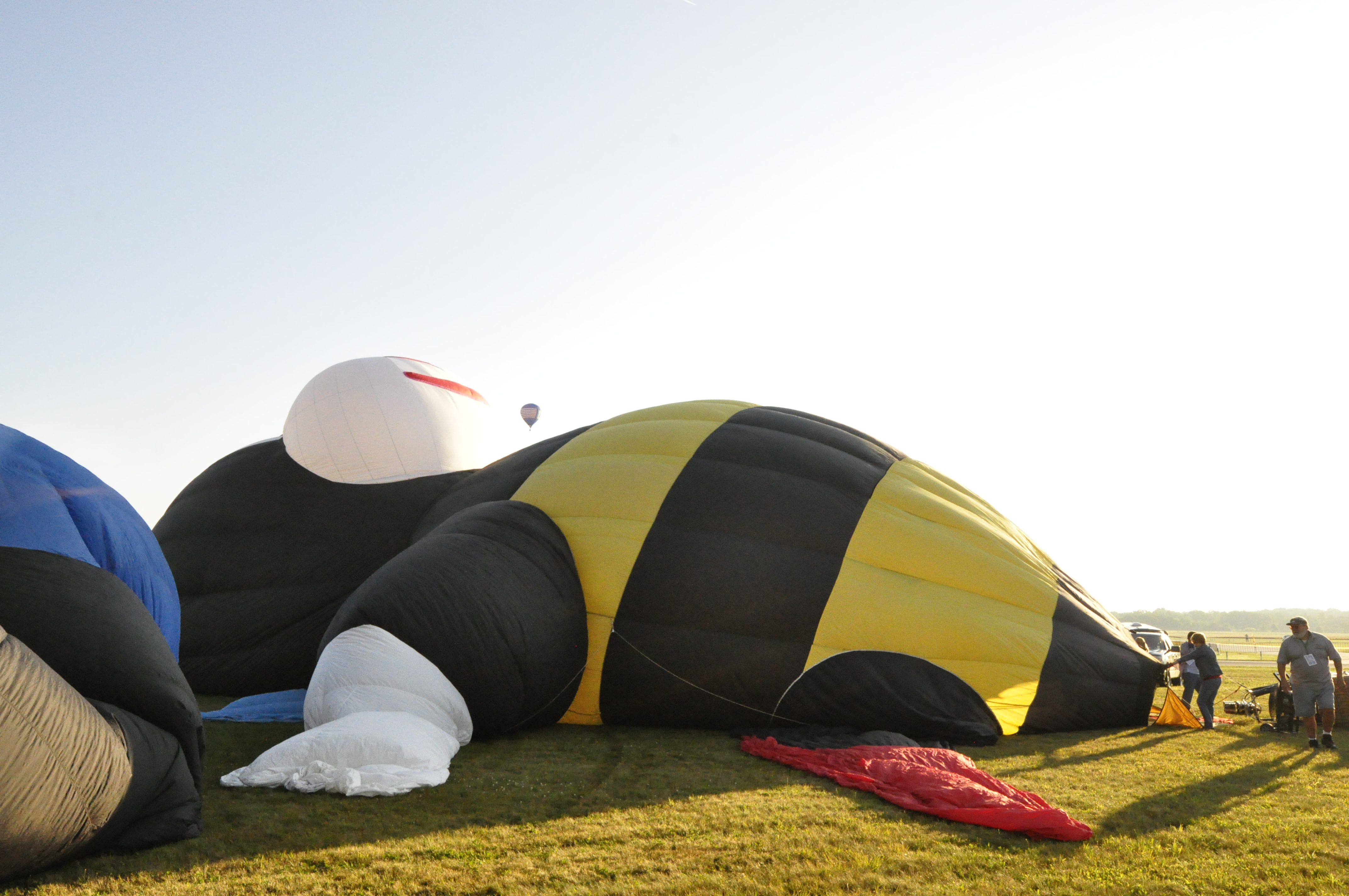 As chase team we jumped into our car and followed Joey as he flew through the air. Watching his every move we navigated down country roads to stay on his tail (or stinger). You never know when a balloon will land so we had to be ready. He eventually landed in a small field in a residential area. We trekked through backyards and weeds to the balloon where we deflated him, packed him up, and prepared him for his afternoon flight.