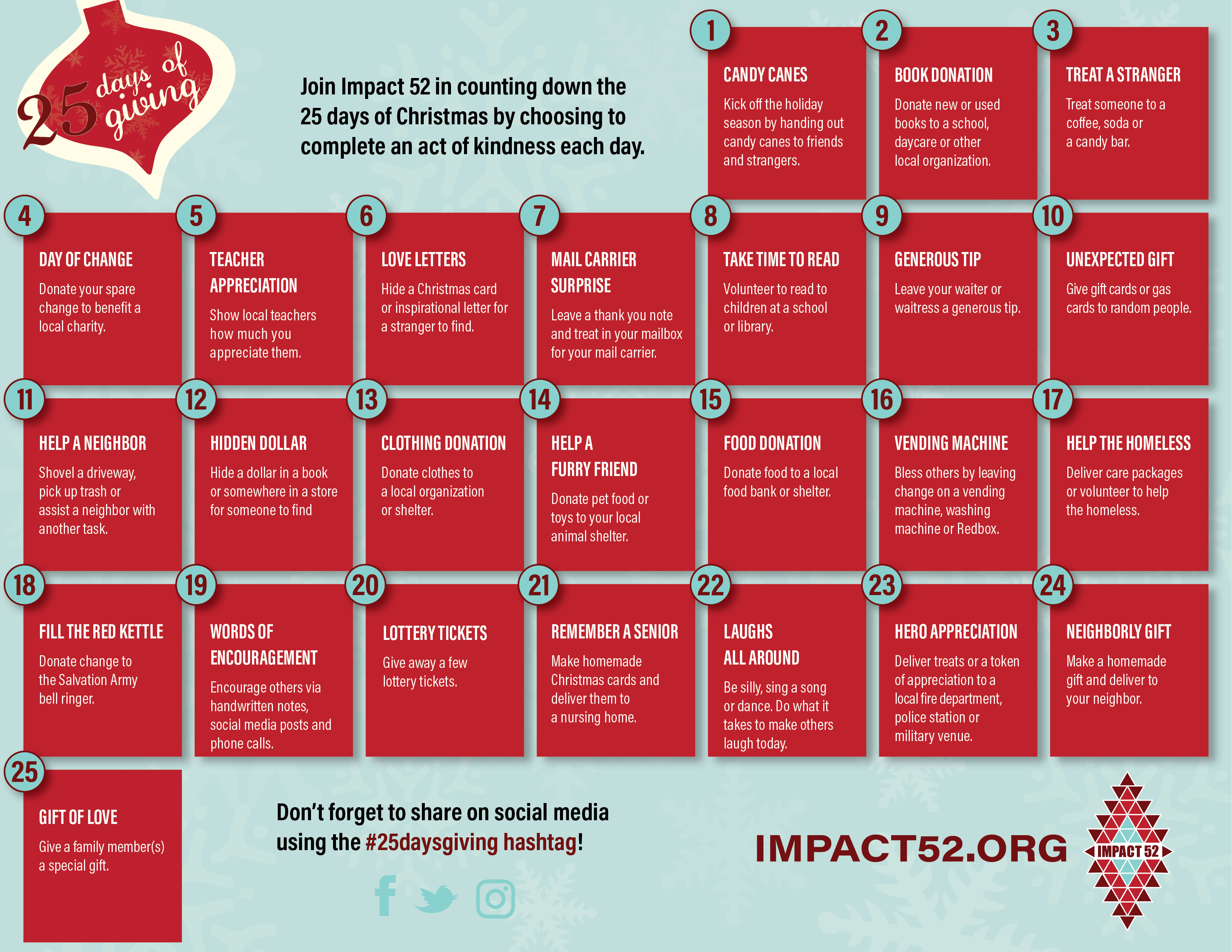 We will share each day’s experience through Social Media and we ask that you do the same. Share your pictures and videos on Facebook, Twitter and Instagram using #25DaysGiving and tag Impact 52. You can also email us your stories at impact52org@gmail.com. We will compile the stories and images and share them with those who follow our blog. Together was can make this the best season of giving to date. Are you ready?
